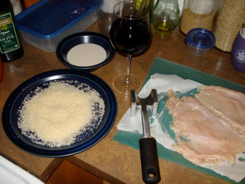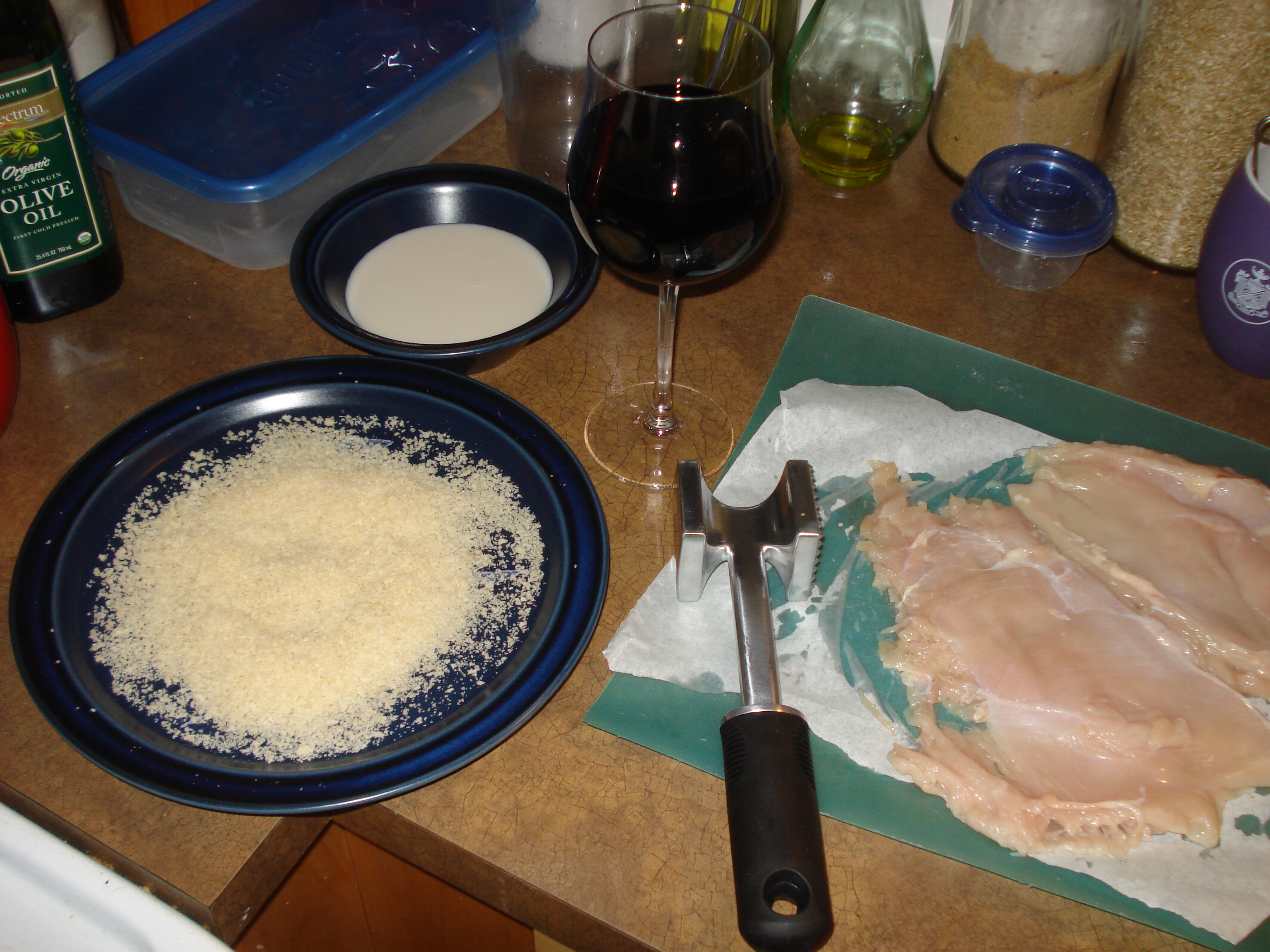 Then the fun part: pounding the shit out of some chicken. I gave the chicken breasts Gwyneth’s recommended salt scrub, after which I was told to dry them with paper towels. Well, we’re out of paper towels, so toilet paper will have to do. This meal was already turning into a cheap imitation of Gwyneth’s Chicken Milanese, so why not throw all respectability out the window and incorporate toilet paper into the disaster? Once the chicken was dried (and any lingering strips of toilet paper carefully picked off), I placed it between two sheets of parchment paper and went to town with a mallet. Have you ever tenderized chicken before? It’s fantastic. The chicken really flattens with every whack of the mallet, giving you a strangely satisfying feeling of demolishing something. It’s great for frustration.