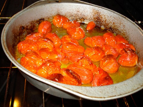 The first step when I returned home was to cover some cherry tomatoes in olive oil and a pinch of coarse sea salt, and then toss them into the oven for 45 minutes, until they’re “split and blistered and super sweet.”