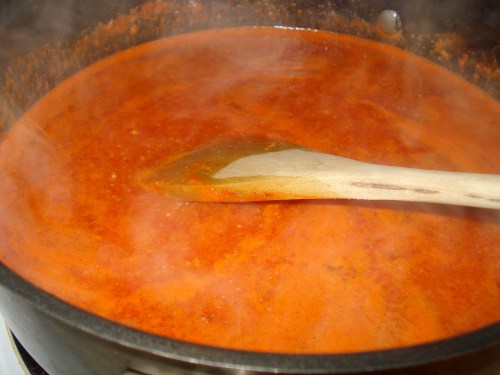 An hour later, I pureed the ingredients in a blender and returned it to the pot. The sauce was much more orange than typical sriracha, and this is where I began to doubt the recipe. But I simmered it for 15 minutes, and slowly the sauce began to boil down and become a much more vibrant red. Sorry for doubting you, Lee Gross! Kind of.