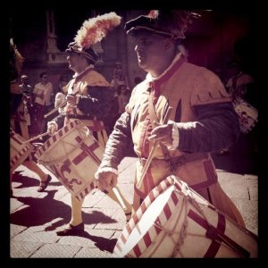 As we stood and finished our wine, we heard drums and trumpets. And then, just like that, the beginning of St. John’s parade passed directly by. This was serendipity at its finest, as we were able to see the entire parade, while standing and enjoying some of the best wine we’d had in Italy. The parade itself was fascinating — everyone walked very, veeeeery slowly, and were decked out in strange Renaissance garb, carrying ancient weapons. Oh, and there was a cow in the parade? Weird stuff.