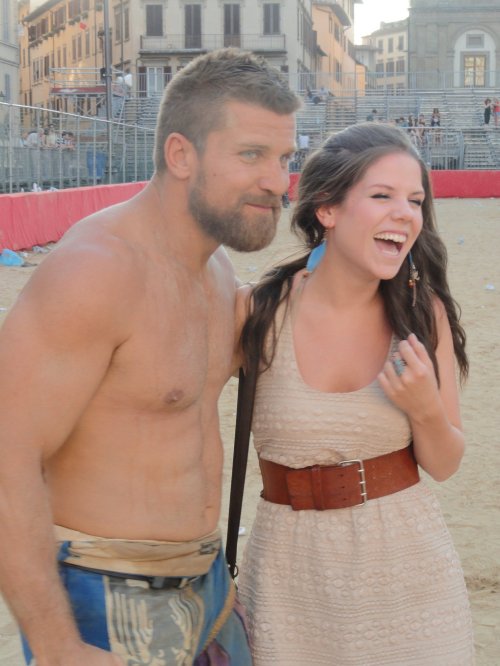 The entire thing was just fascinating, and was a delightfully unexpected welcome to Florence. After the match was over (Blue won, for the curious), we decided to walk down to the arena and see if we could get a closer look. Surprisingly, the second the match was finished, the gates were opened and anyone was allowed to wander onto the field! This would never be allowed in the United States (of course, this whole EVENT would never be allowed in the United States). We walked onto the field, passing no less than 15 ambulances parked nearby, and took a few cheesy photos beating each other up. Then, like magic, an actual warrior appeared! A member of the Blue team came jogging by to retrieve his shirt from the field, so Sara stopped him and asked if she could have a picture. He kissed her on the cheek, and now Sara wants to marry a gladiator. And he was very charming, for someone who had just spent 50 minutes kicking the living shit out of 27 people.
