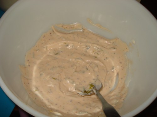 While the water slowly, slowly climbed toward its boiling point, I prepped the sauce. Mere melted butter is not good enough for Gwyneth, so I had to mix Vegenaise, ketchup, mustard, horseradish, chives, and cornichons. At this point, J was definitely wondering what he had gotten himself into. However, a dipped finger in the odd-looking sludge revealed the sauce to be quite tasty. Who would have thought?