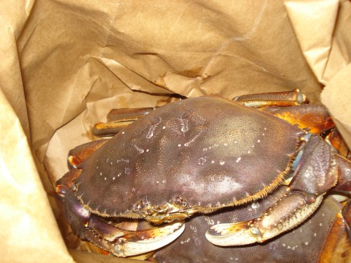 For two crabs, their journeys ended in a crowded tank at a chaotic seafood emporium in Southeast Portland, almost more aquarium than grocery store, where they were unceremoniously plucked from among their friends and family and shoved into a triple-layered bag. One valiant crab frantically gripped the edge of the bag, refusing to submit to his fate. But he was no match for his Asian wrangler, and he had no choice but to ultimately land in the bag, atop his fellow. I paid for my bounty, and we headed home. I tried not to consider what was in the back of my car, but the crinkling of the bag behind me at every stoplight was the crabs’ way of pleading, “We’re still here. We’re still alive.” I drove on, and tuned out their cries.
