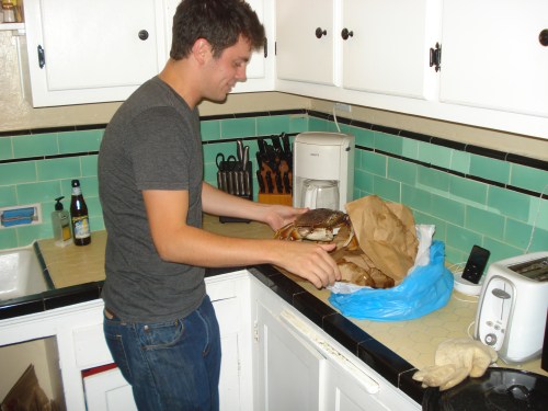 The supplies required were fairly simple, although we made sure to acquire the makings for a cheese plate and a salad, just in case things went awry. I didn’t know if I could actually do it, and my date’s assertion that he may be “too chickenshit” to take over for me if my nerves fail did not give me confidence that these crabs would actually ever experience being boiled alive. As my friend Elizabeth warned me, “You’re probably just going to end up eating PB&J sandwiches and making mazes for the crabs on your kitchen floor.” Which, actually, didn’t sound like such a bad idea.