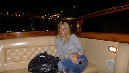 Exhausted and spent after what was clearly a HIGHLY grueling trip, Gwyneth returns to the airport in the back of a boat, makeup-less, and next to, I guess, someone’s garbage bag?