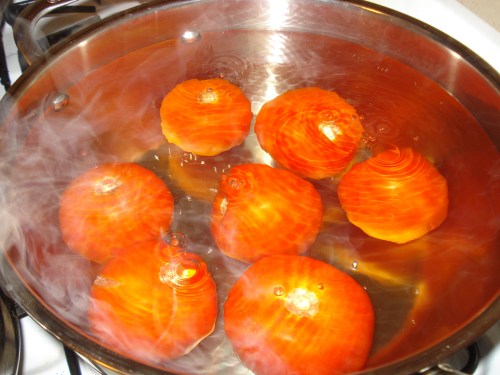 I then set about boiling two large pots of water, to help me peel my tomatoes. If you’re not familiar with this method (which, for the record, I already was — look at me, all kitchen-savvy!), it’s pretty easy: Boil water. Score the bottoms of your tomatoes. Drop tomatoes in the boiling water for 30 seconds. Remove from water, drop into an ice bath. The skin will slip right off. Now, I only had four ice cubes in the freezer, so my ice bath was more of a tepid water bath. But it worked just as well. I made sure to refill the ice cube tray because, duh, gin and tonics.
