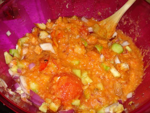 From here, the recipe gets pretty simple, or at least on paper it looks simple. Mix together the peeled and cored tomatoes, the roasted peppers, a red onion, a diced English cucumber, some garlic, salt, pepper, day-old bread cubes, red wine vinegar, and olive oil. Puree them in a blender, until you’ve reached the consistency you prefer. Aaaaand this is where things came to a screeching halt. You see, I don’t have a blender. I only have a Magic Bullet.