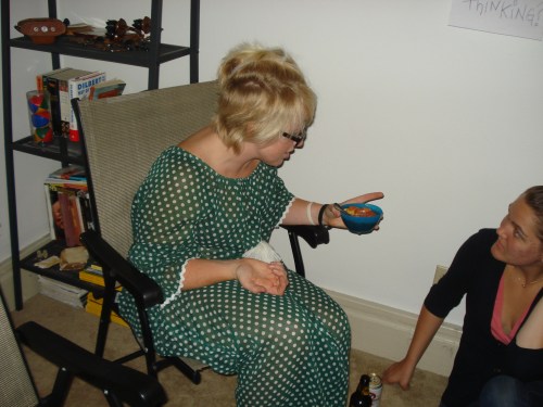 Hannah — now sporting a slightly see-through yet tasteful clown suit — enjoys more gazpacho.