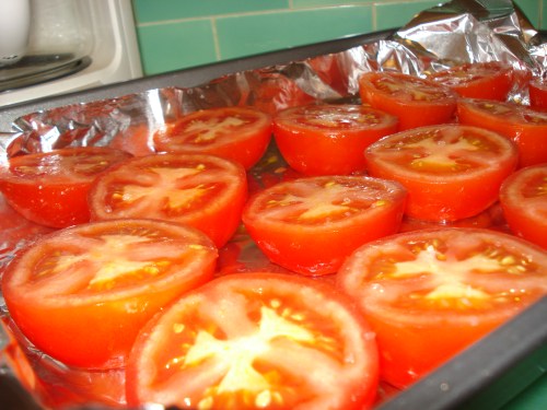 So I cut my (vine-ripened) tomatoes in half horizontally, rubbed them with olive oil, sprinkled a little salt on them, and threw the pan in the oven for three to five hours. Which meant I had time to do all sorts of things around the house, which was kind of nice, I guess. And, since I was technically cooking, I had an excuse to drink wine the whole time, too! Maybe Gwyneth is onto something here.