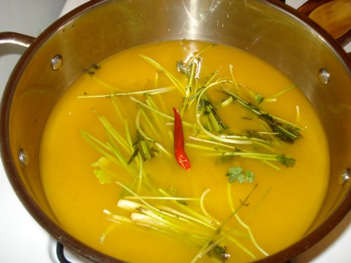 I started by heating the vegetable stock over a low flame with cilantro stems, a dried whole red chile, and two cloves of crushed garlic. Meanwhile, I toasted another dried red chile, which immediately burst into flames and was charred black in two seconds, seeing as it was dried. So I don’t really know what the point of that was, but whatever.