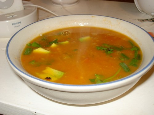 In a skillet, I sauteed onions, garlic, and the roasted (and now burnt) red chile. I then added a can of tomatoes, and let the mixture simmer for 40 minutes, or just the exact amount of time to watch last week’s episode of the Real World (and I’m sure you don’t watch it, but let me tell you: the people this season are TERRIBLE HUMAN BEINGS. Moreso than they normally are!). Once the liquid had almost all simmered out, I pureed the mixture in the Magic Bullet (which took a while — a blender may be a worthwhile investment soon). I then poured the pureed tomato mixture into the vegetable stock, which looked rather like vomiting into muddy water. REALLY unappetizing.
