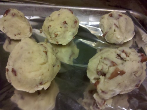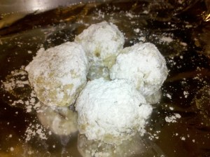 Plus, they’re so easy! Using my hands, I just mixed together two sticks of unsalted butter, a bit of flour, and two cups of crushed pecans. I then rolled them into small balls and baked them for roughly 20 minutes. Once they had cooled a bit, I just rolled them in powdered sugar, and there we have Mutti’s Butterballs! Or, as we’ve taken to calling them: cunt balls.