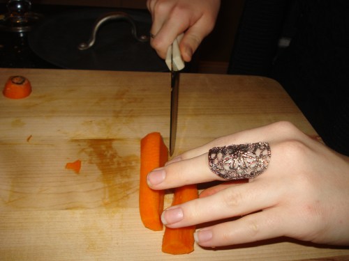 I then got to work on the roasted vegetables, slicing sweet potatoes, parsnips and carrots into French fry-sized pieces with the help of my sister Sara and my uncle Kurt. But, here’s the thing: My parents have a beautiful house and an awesome kitchen, and yet not a single decent knife to be found. It took far, far too long to slice these vegetables, and my sister and I found ourselves sweating as we hacked and sawed with blunted blades at the vegetables. We may as well have been using Stone Age tools. Fix this before Christmas, please, Mom and Dad.