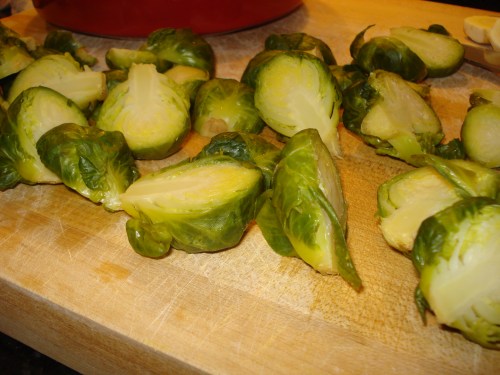 Most of the day was spent drinking and watching football while the turkey slowly roasted away in our oven. About an hour and a half before dinner was to be served, I finally got to work. I steamed the Brussels sprouts until they were tender, while various family members meandered over to poke and prod and sniff the sprouts like the chimps in 2001: A Space Odyssey. (Love you guys, by the way!) However, my cousin’s girlfriend Jamie is a vegetarian who often has difficulty at our meat-laden family gatherings finding enough to eat, so she was thrilled at the idea of Brussels sprouts and roasted vegetables. To some, Gwyneth is a true hero.
