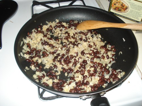 Anyway, I cooked the stupid rice. Once it was almost done, I then sauteed some finely diced onions and garlic with a bit of cumin. After letting the onions sweat for a while, I added the rice, a can of drained and rinsed black beans (organic, of course, and also transported cross-country from Portland; I always insist my canned beans be driven 3,000 miles before I eat them), and some salt and pepper. I stirred it all together and then proceeded to mash it all with a potato masher. Excepppppt we don’t have a potato masher. But shitty improvisation is a hallmark of the Danny/Gwyneth Project, so I grabbed a slotted spoon and went to town on the mixture. And it actually worked quite well, if I may say so.