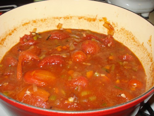 I inserted the dead thing in the oven, where it would sit for two hours as I rotated it every half-hour. It pretty much immediately started to smell like the greatest thing ever. Also smelling like the greatest thing ever (gooooood segue): the diced duck bacon I was sauteeing in a pot on the stove. Once it had crisped up, I dumped in a whole pile of diced carrots, celery, garlic, and onions, and sprinkled some spices all over the mess but I don’t remember what spices those were so SORRY. It smelled ridiculous, though, and only kept getting better. Those simmered for about 20 minutes, before everything was nice and tender, and then I dumped in two big cans of whole peeled tomatoes, a little bit of water, and some Italian red wine. Gwyneth DEMANDS Italian wine, and my parents had given me a bottle of Italian red for Christmas, so I uncorked that baby and poured a little into the mix. And oh my god did it smell perfect after that point.