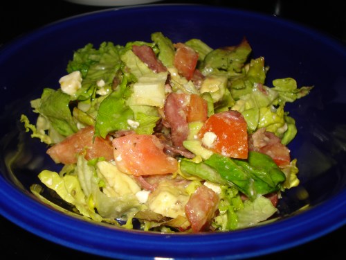Once the duck has been added to the ragu, you simply turn the heat extra low and let it simmer for anywhere from one to four hours. But I still had to make the salad, so I chopped two heads of Boston lettuce and threw it in a bowl, followed by a diced avocado, a diced tomato, crumbled Gorgonzola cheese, and, of course, a heaping pile of fried duck bacon. The dressing (a separate recipe! Yes!) was pretty standard stuff: Dijon, maple syrup, red wine vinegar, canola oil, olive oil, salt and pepper.
