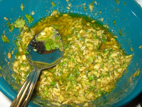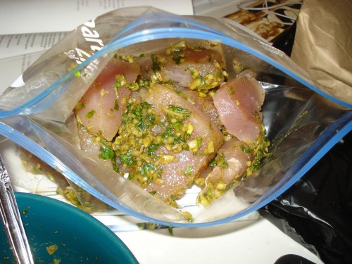 The first step for the tuna steaks was to combine cumin and fennel seeds with salt and pepper and crush it using “a mortar and pestle, coffee grinder, or Jamie Oliver’s ingenious Flavour Shaker,” which OBVIOUSLY all of us have. In actuality, I have none of the above, so I just crush them in a plastic bowl using the handle of a knife. Oh, what I wouldn’t give for one of Jamie Oliver’s ingenious Flavour Shakers! I then added some freshly minced ginger and cilantro and crushed those with the spices until a rough paste formed, which I then mixed with a bit of olive oil. What resulted was kind of like a pesto, and it smelled like some sort of Indian paradise. I combined the spice mixture with the tuna steaks in a Ziploc bag and let them sit in the refrigerator for a few hours.