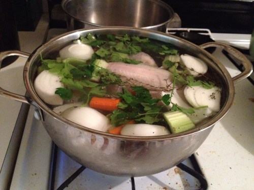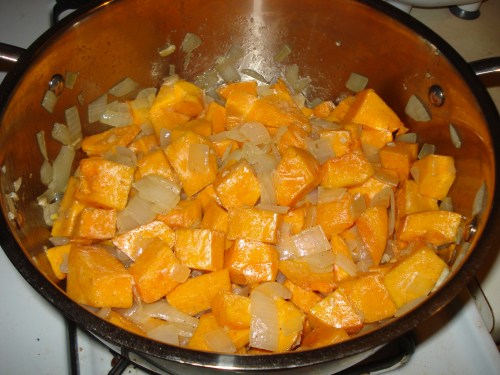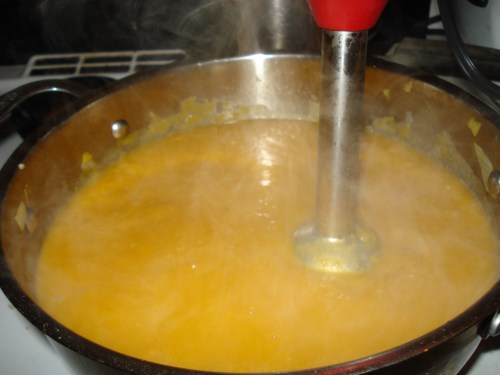 Meanwhile, I heated some olive oil and butter in a soup pot, and sauteed a couple yellow onions and minced garlic, which I then spiced with salt, pepper, and garam masala. I then threw in a diced butternut squash, which I let soften for a few minutes. I then covered it in vegetable stock and simmered until the squash was soft. Ultimately, I blended the soup using my VERY wonderful hand-blender I got last Christmas, which was pretty damn fun. And honestly, the soup smelled awesome. I’ll give Gwyneth this: she can throw together a pretty decent soup. THERE, I SAID IT.