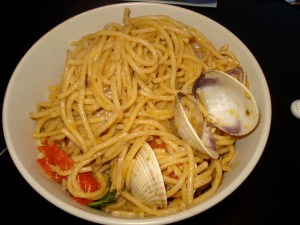 Things have been pretty negative around here lately, huh? Between the horrors of locating duck bacon (although I am beginning to enjoy the bewildered looks I get when I ask grocers and butchers, “Do you know anywhere I can find duck bacon?”) and the sheer amount of time it takes to complete a single recipe, let alone track down the ingredients, I had all but given up on “My Father’s Daughter.” And then, Spaghetti Alla Vongole arrived. Just when I think I’m out, they pull me back in.